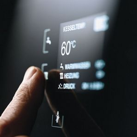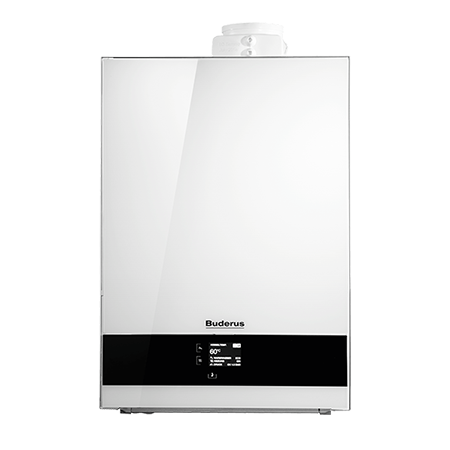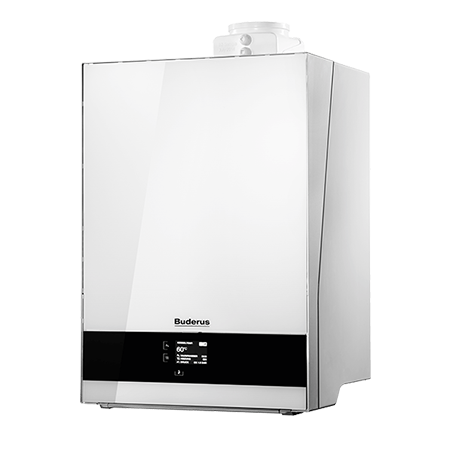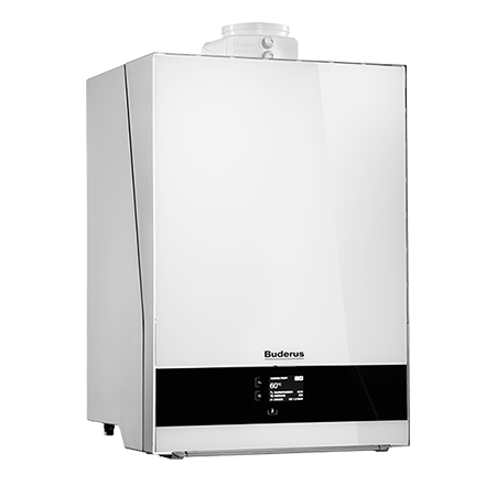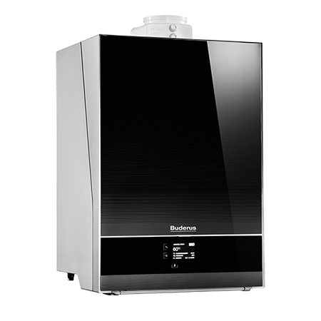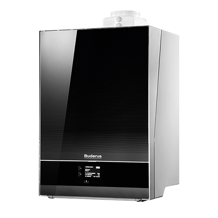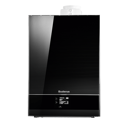 wandhängendes Gas-Brennwertgerät mit AluGuss Wärmetauscher und Frontverkleidung aus Buderus Titanum Glas mit Touchscreen Display