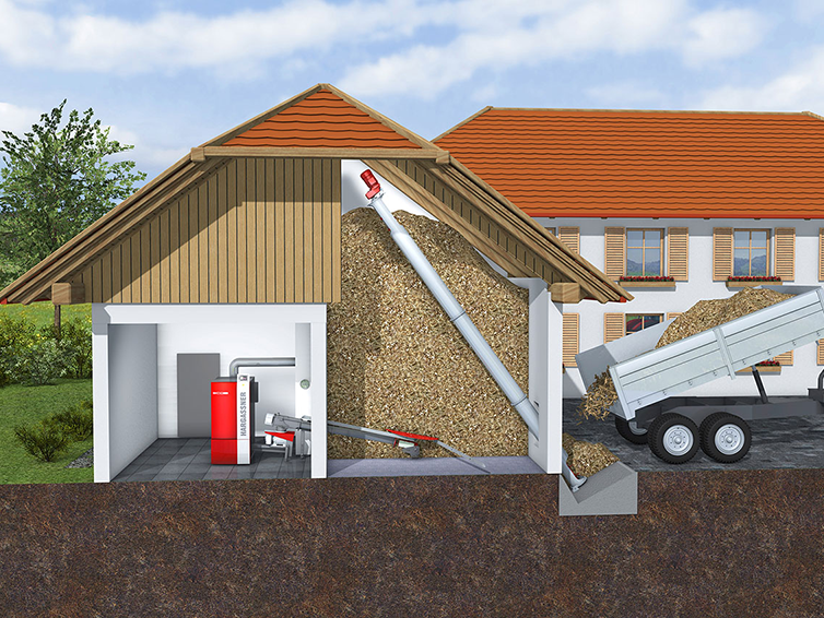 Die Befüllschnecke von Hargassner mit variabler Neigung ermöglicht das bequeme, automatische Befüllen von nur schwer zugänglichen Stellen wie beispielsweise hohe Lagerräume mit Dachgiebel.